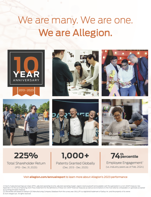 In 2024, Allegion received the Gallup Exceptional Workplace Award, recognizing our company for having one of the most engaged workplace cultures in the world. We truly believe this culture and our core values are key drivers of our success. In 2024, we delivered a record $3.8 billion in revenue and record adjusted Earnings Per Share (EPS) of $7.53, while also expanding margins to be the highest ever in our company’s history.1 Years like 2024 underscore Allegion’s resilient business model and the strength of our balance sheet.